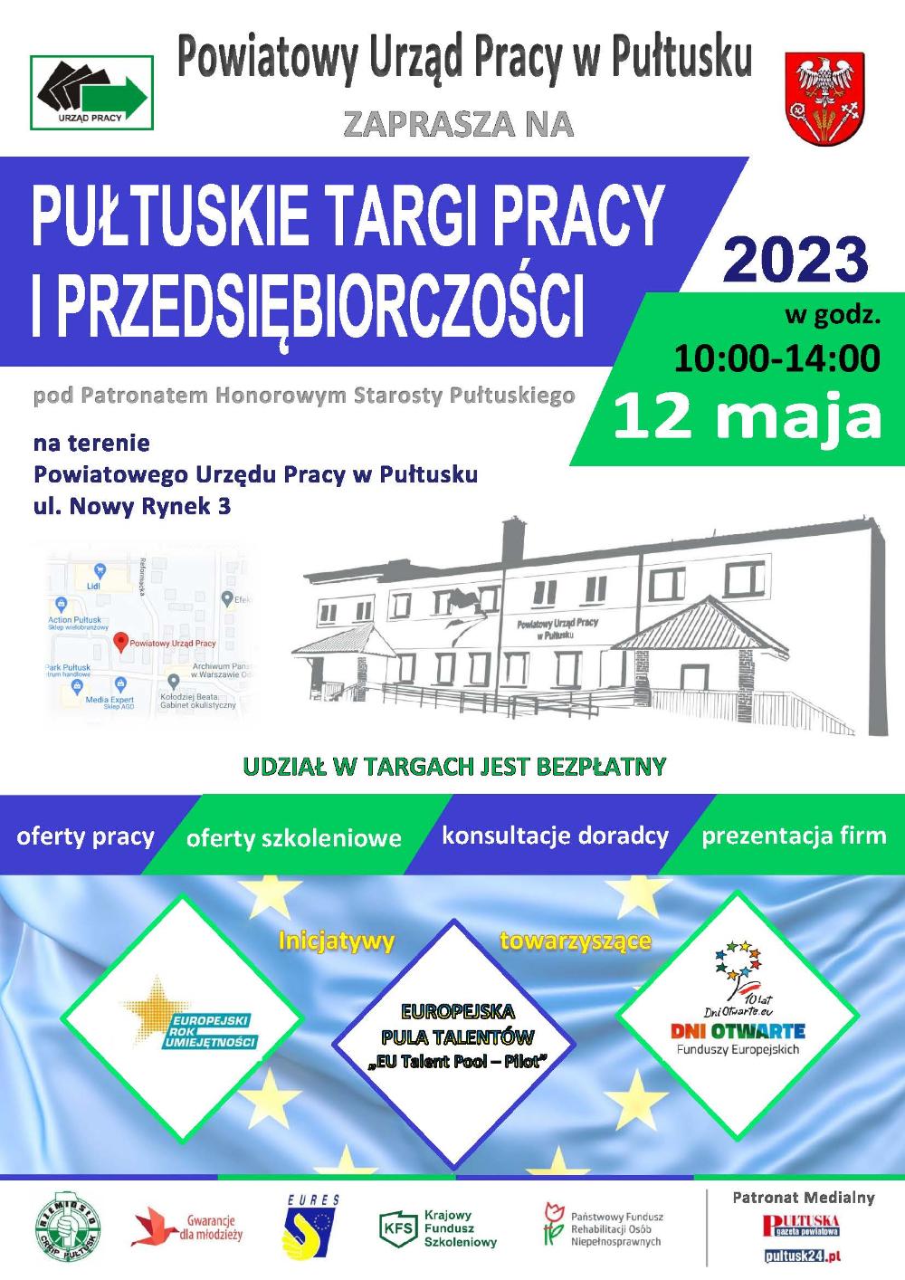 12 maja, Pułtuskie Targi Pracy i Przedsiębiorczości 2023, 10:00-14:00, Powiatowy Urząd Pracy w Pułtusku, ul. Nowy Rynek 3.