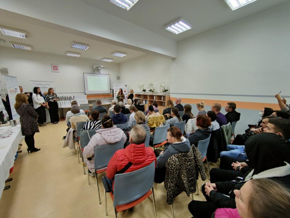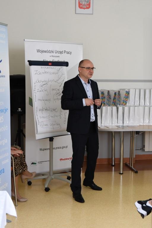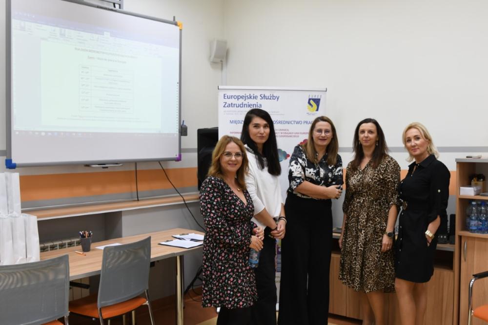 Na zdjęciu znajduje się grupa kobiet przy ekranie projekcyjnym, na którym wyświetlony jest slajd z tekstem. Kobiety są elegancko ubrane i wydają się przedstawiać lub omawiać temat dla grupy uczestników. Za nimi znajduje się baner Europejskich Służb Zatrudnienia, dotyczący międzynarodowego pośrednictwa pracy.