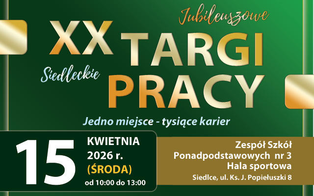 Powiatowy Urząd Pracy w Siedlcach oraz Wojewódzki Urząd Pracy w Warszawie Filia w Siedlcach zapraszają do udziału w XX Jubileuszowych Siedleckich Targach Pracy, które odbędą się 15 kwietnia...